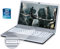 Ноутбуки VAIO серии F невероятно эффективны благодаря датчику внешней освещенности, который для экономии энергии корректирует яркость экрана в светлых местах. Нажмите на кнопку Display OFF для мгновенного отключения экрана и экономии электроэнергии — идеальная функция, когда слушаешь музыку.