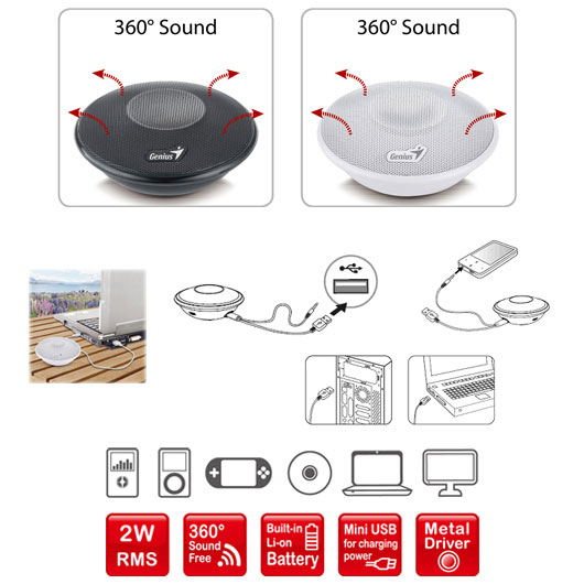 Высокое качество звучания достигается благодаря 1,25" динамику с металлическим диффузором. Форма устройства в виде «летающей тарелки» позволяет равномерно распространять звук во все стороны. А разъем 3.5 мм обеспечивает подключение к ноутбуку или MP3-плееру.